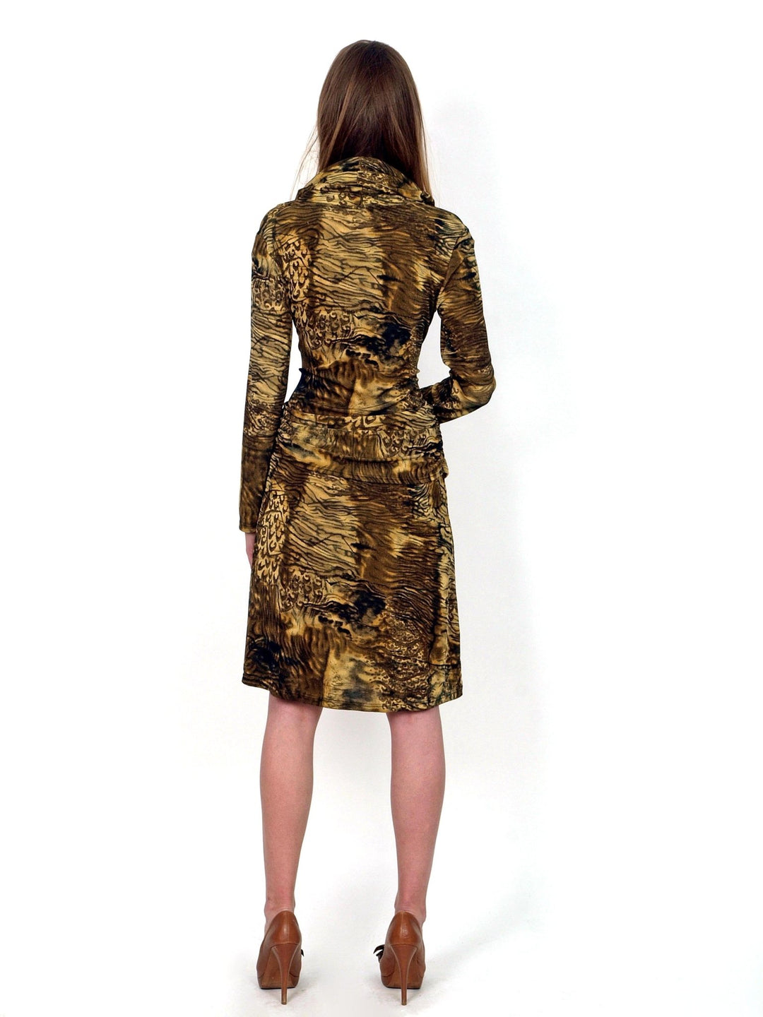 A long-sleeved dress just above the knee is the perfect choice if you want to bring playful style to your business style. Mustard color dominates this dress and makes it a favorite garment this winter. Around the hips is a belt of the same material with a golden brooch. The collar collapses casually, but has the ability to go down to the shoulders and in a moment business dress turns into the perfect cocktail dress. Composition: 94% cotton, 6% spandex