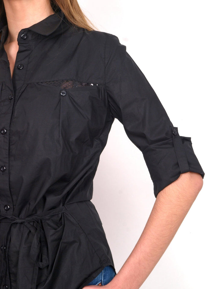 Attractive, long-sleeved black shirt. It follows the line of the body, with a cut pattern. A button sewn on the sleeve that instantly transforms it into a short sleeve shirt if you wish. An interesting and effective detail is certainly the small opening through which springs ceremonial material surrounded by sequins. At the waist, the shirt connects with a narrow and discrete link that is of the same material as the shirt itself. Suitable for wearing since it is 100% cotton.
