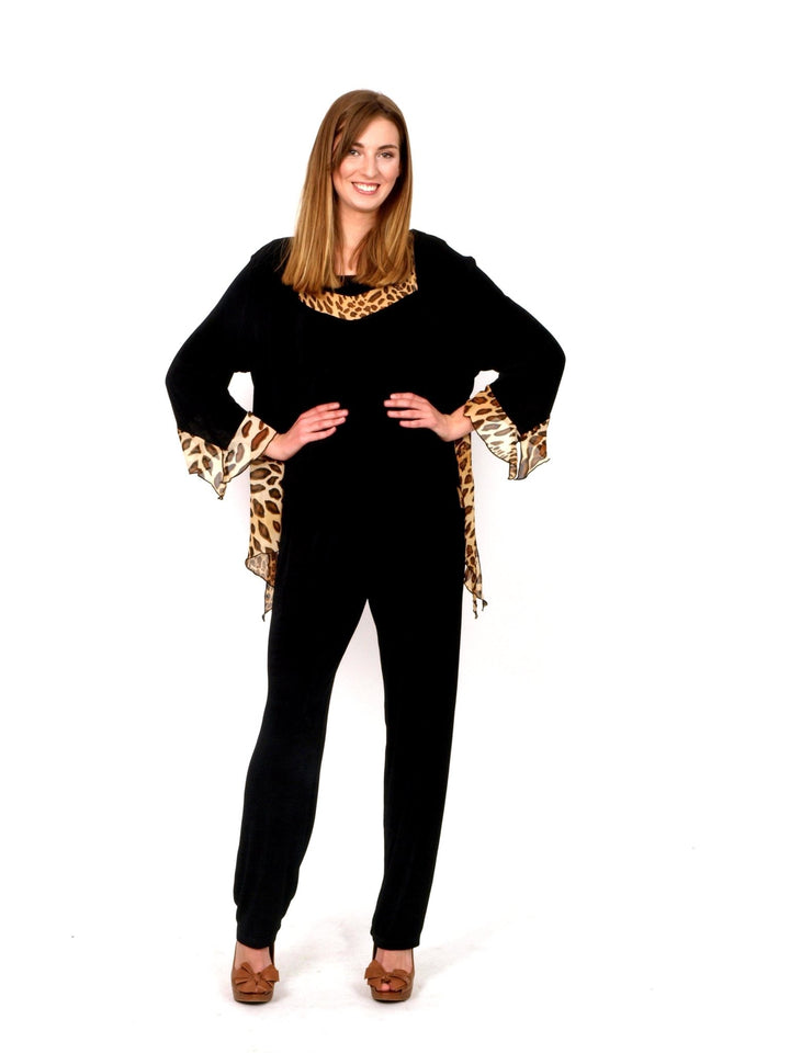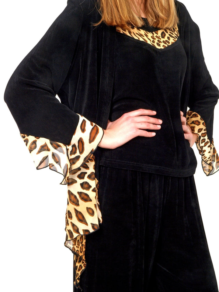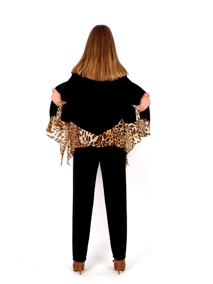 Effective and simple three-piece velvety kit. Black top accompanying body line, round cutout with tiger pattern. Long, black pants of a wider model. Jacket of the same material with a brindle pattern at the bottom of the sleeves and at the edges. An ideal and bold combination for the most glittering occasions. Composition: 94% acetate. 6% spandex