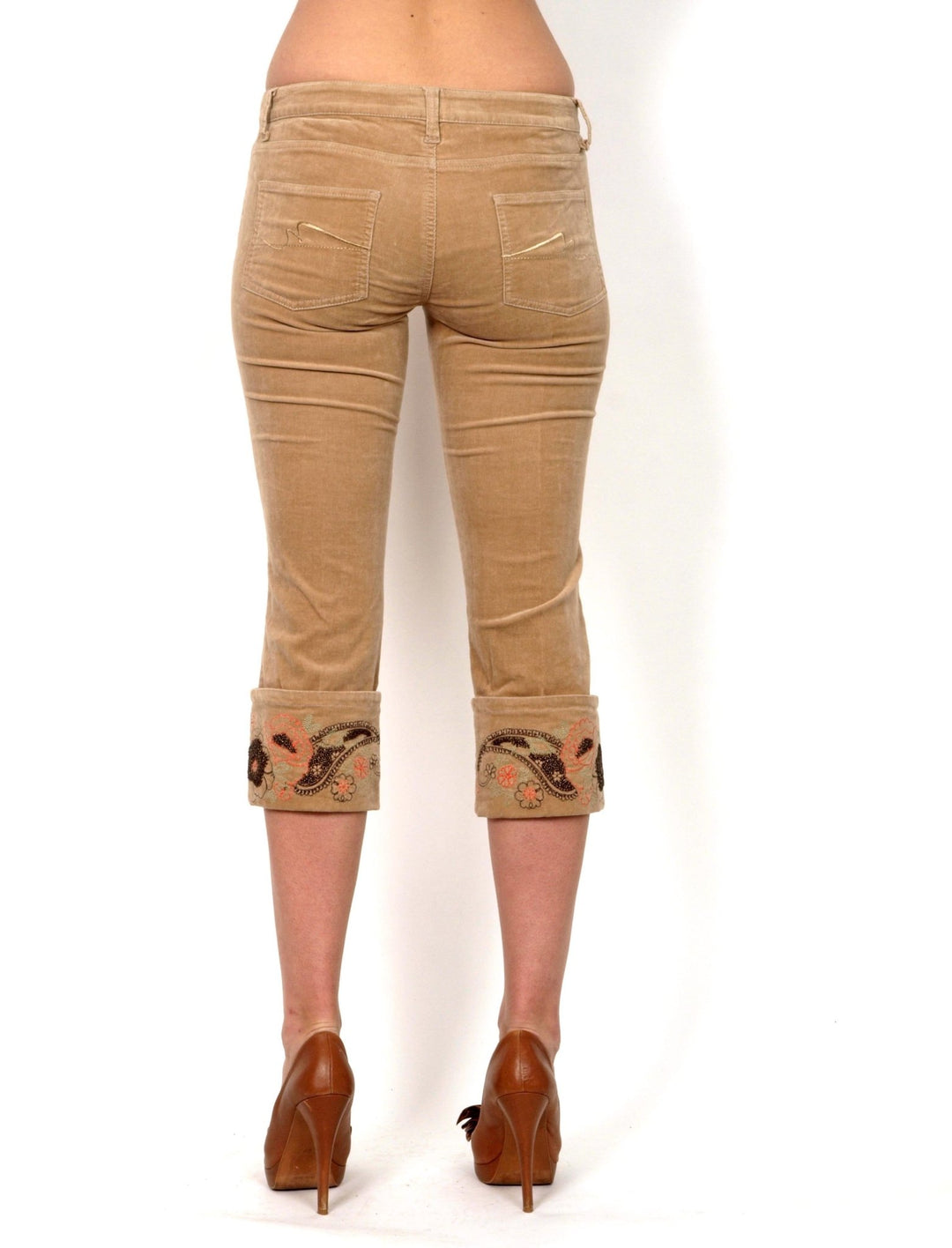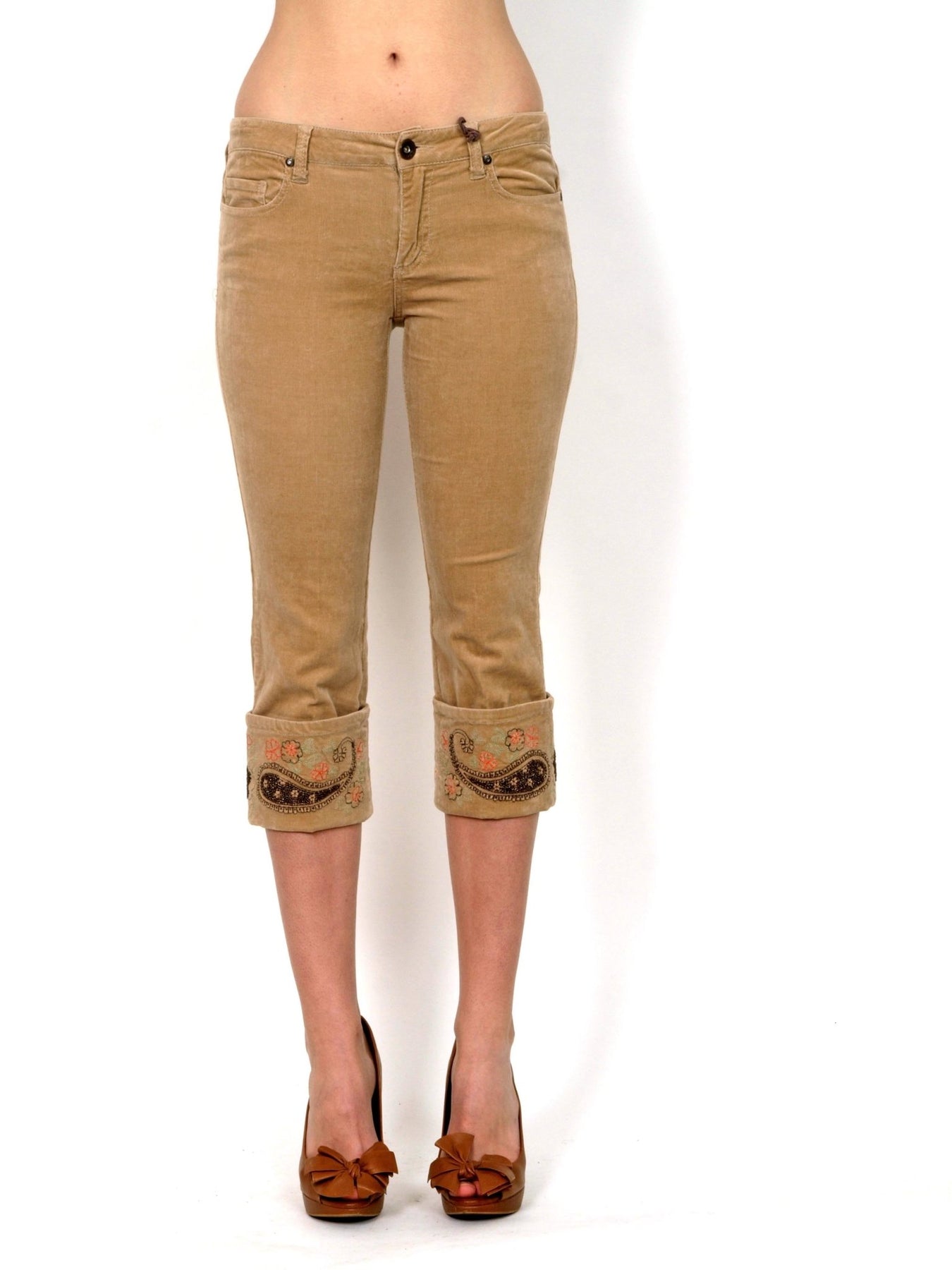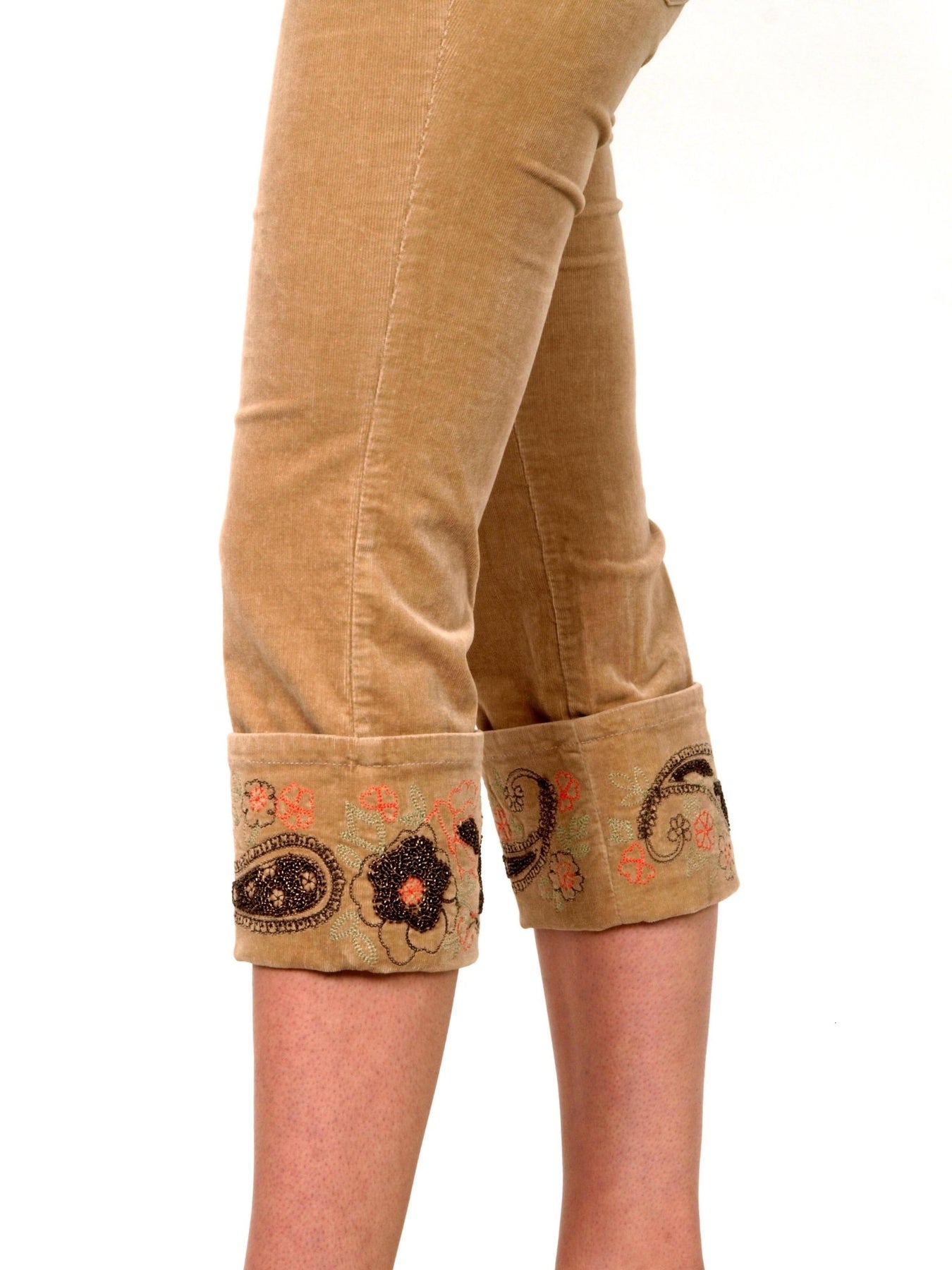 Capri pants, low waist, beige velvet with a popular embroidery at the bottom of the socks. The pants are tight and perfectly highlight the body line. An interesting detail is the embroidered floral motifs that contribute to the boho style that tops the list of most popular styles this winter as well. Comfortable to wear thanks to the high content of cotton. Composition: 97% cotton, 3% spandex
