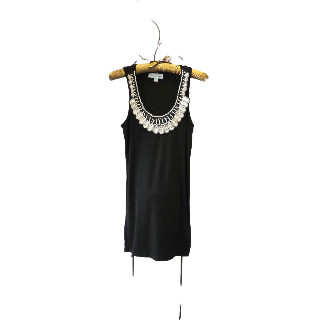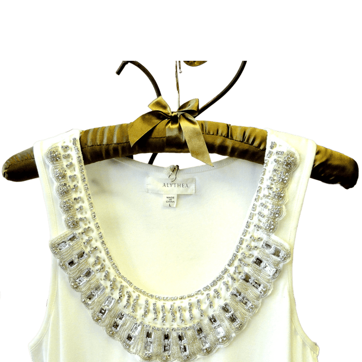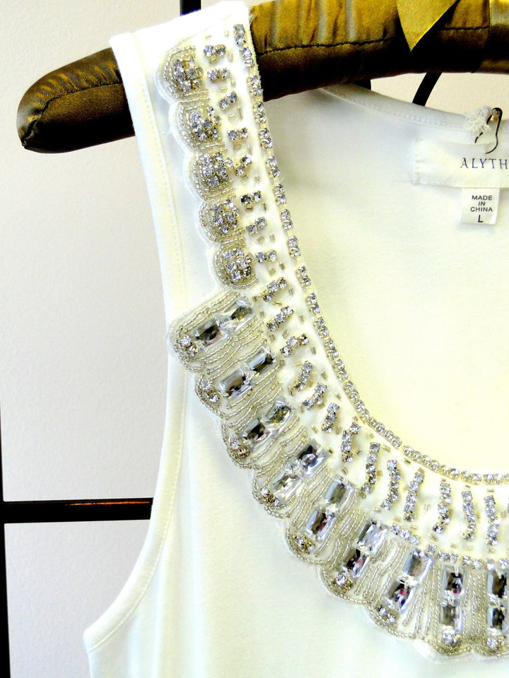 Every fashionable femme needs a versatile tank dress! Whether it's worn alone or under a favorite jacket, this chic dress with crystal beaded accents is sure to impress. Available colors include black and ivory. - 94% Rayon, 6% Spandex - Made in China
