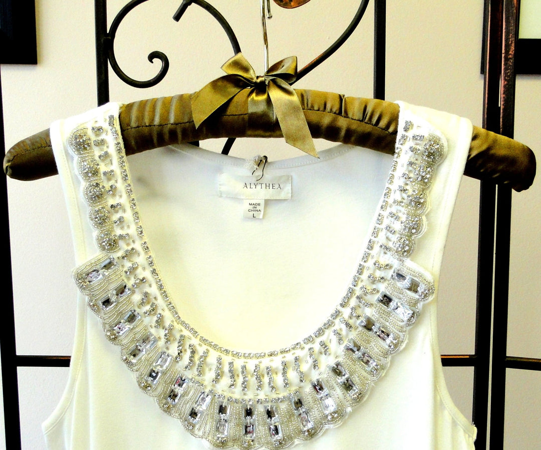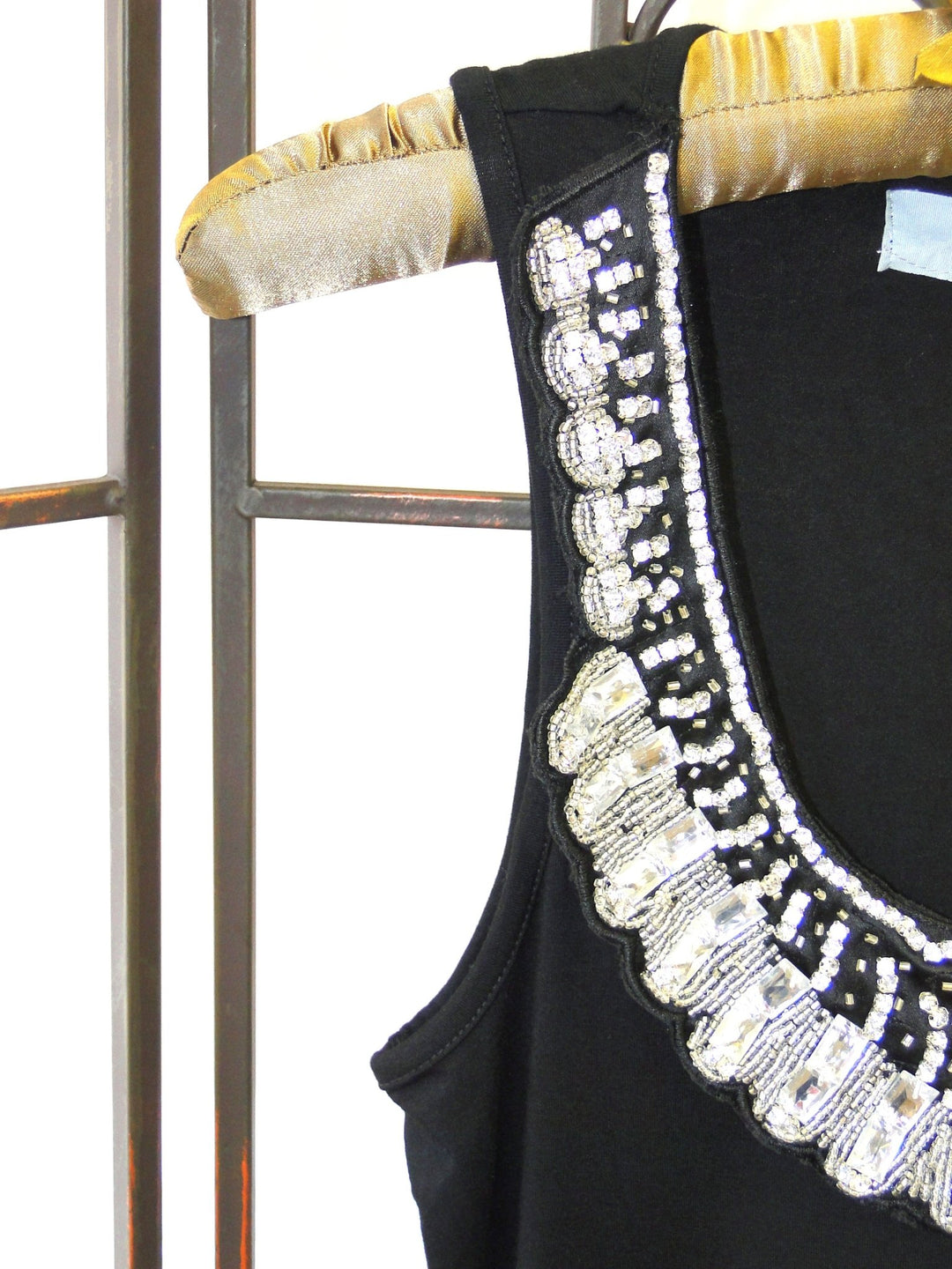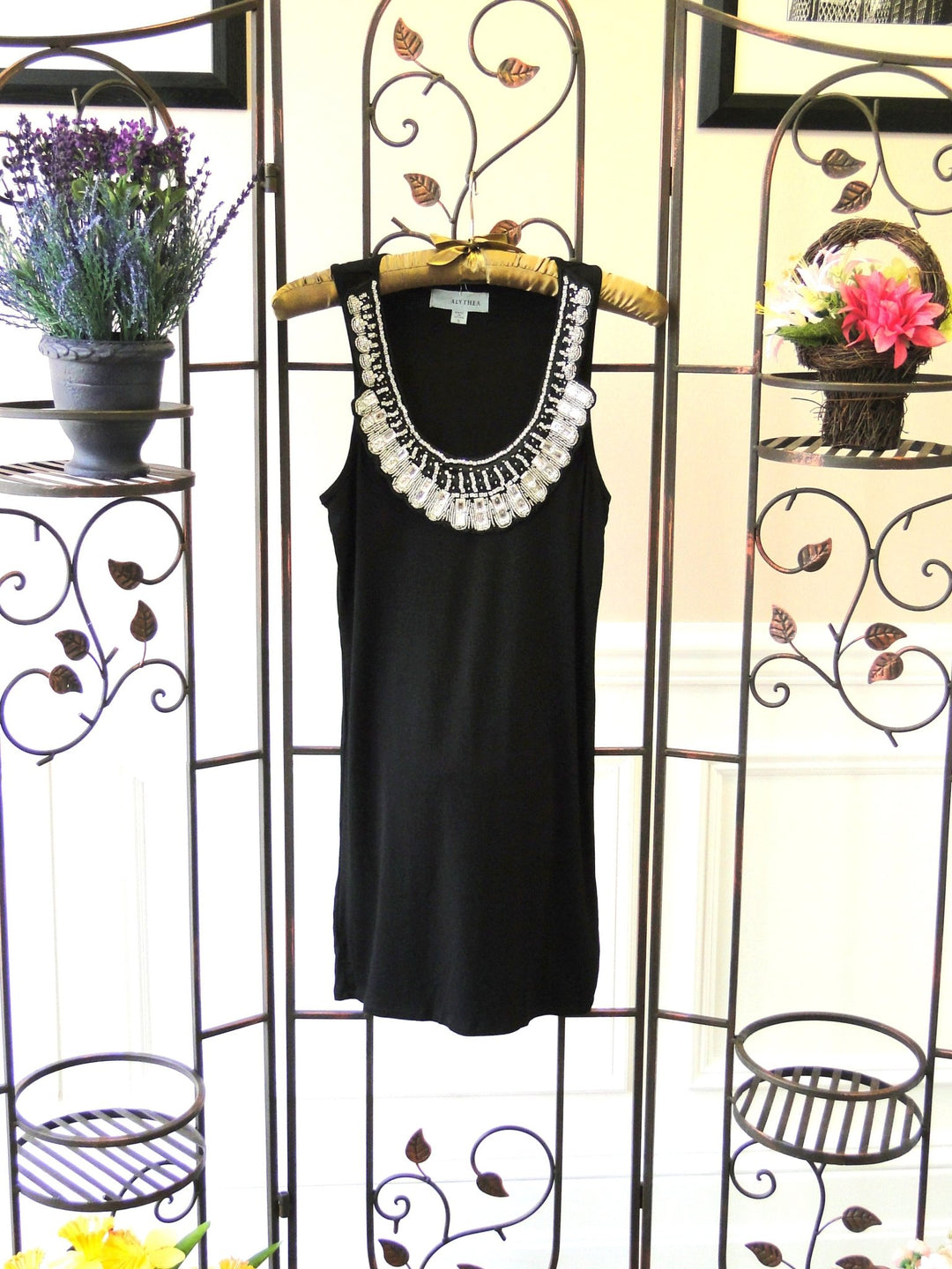 Every fashionable femme needs a versatile tank dress! Whether it's worn alone or under a favorite jacket, this chic dress with crystal beaded accents is sure to impress. Available colors include black and ivory.